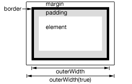 Returns the width of the element, including left and right padding, border, and optionally margin, in pixels. If called on an empty set of elements, returns undefined (null before jQuery 3.0).